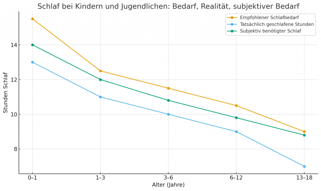 Säuglinge (0–1 Jahr) benötigen 14–17 Stunden Schlaf, verteilt über Tag und Nacht, mit sehr hohem REM-Anteil. Kleinkinder (1–3 Jahre) schlafen 11–14 Stunden und entwickeln in dieser Phase erste Einschlafrituale. Vorschulkinder (3–6 Jahre) benötigen 10–13 Stunden; Albträume und Nachtschreck gehören zur normalen emotionalen Entwicklung. Schulkinder (6–12 Jahre) brauchen 9–12 Stunden, schlafen aber häufig weniger aufgrund von schulischen Anforderungen, Freizeitdruck und Mediennutzung. Jugendliche (13–18 Jahre) benötigen 8–10 Stunden, erleben jedoch einen biologischen ‚Phase Shift‘, wodurch ihre innere Uhr sich nach hinten verschiebt.